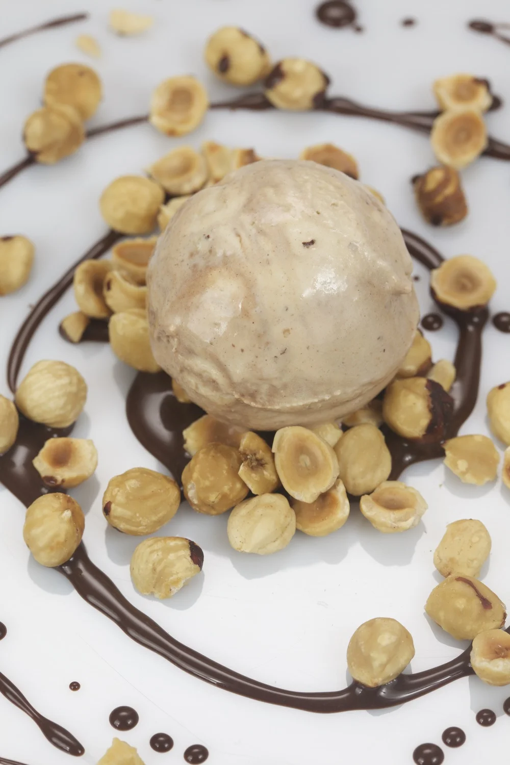Hazelnut chunks and hazelnut frozen dessert fused with a savoury fudge swirl!